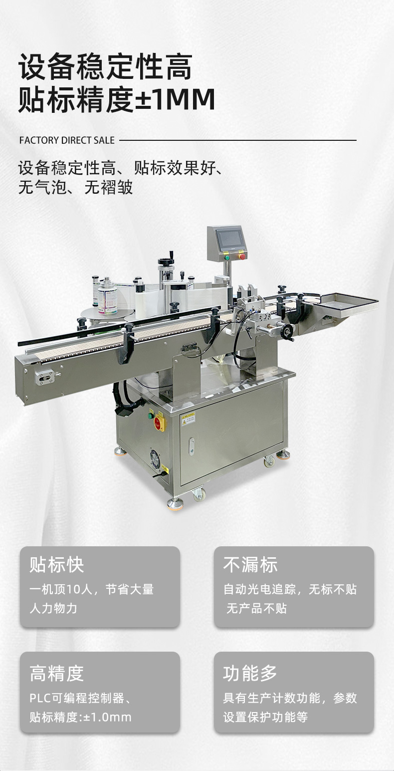 - 适配范围广,换产成本低无需大量更换机械部件,即可兼容直径 30-100mm(部分可定制)的圆瓶,支持玻璃、塑料、金属等不同材质瓶身;同时能处理不干胶、监管码、防伪标等多种标签,换产时仅需在触摸屏调整参数,10 分钟内即可完成切换。