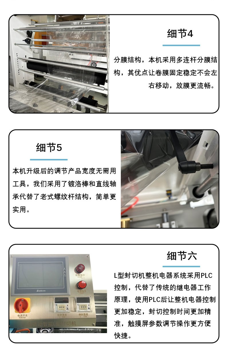 - 封切精度高,包装成品率优异采用 PLC 可编程控制系统与伺服电机驱动,搭配光电感应定位技术,能精准识别产品尺寸,实现膜料的定长输送与封切,封口线平整牢固,切口光滑无毛刺,有效避免因封切偏差导致的膜料浪费,成品率可达 99.5% 以上。同时,特制耐高温铝合金封刀具备防粘刀功能,适配 POF、PVC、PE 等多种热收缩膜,杜绝膜料粘连封刀造成的包装瑕疵。