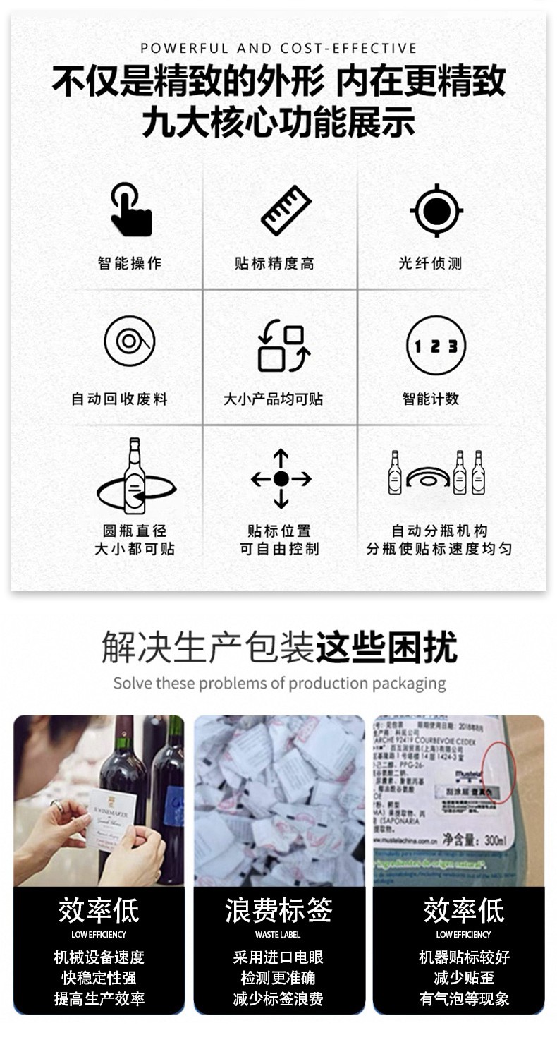 替代人工,降本提质:避免人工贴标歪斜、起泡、效率低等问题,稳定贴标质量,降低单位成本,提升产品包装美观度与竞争力。