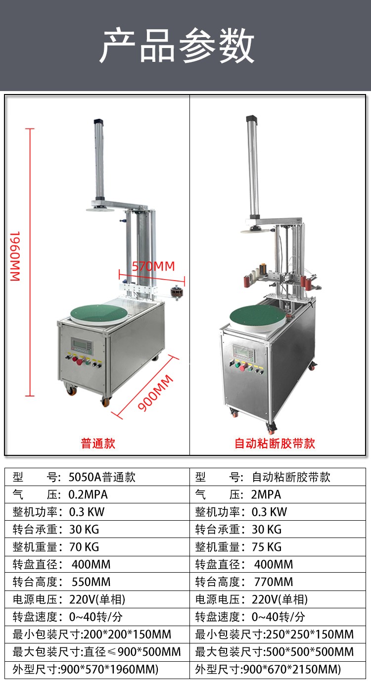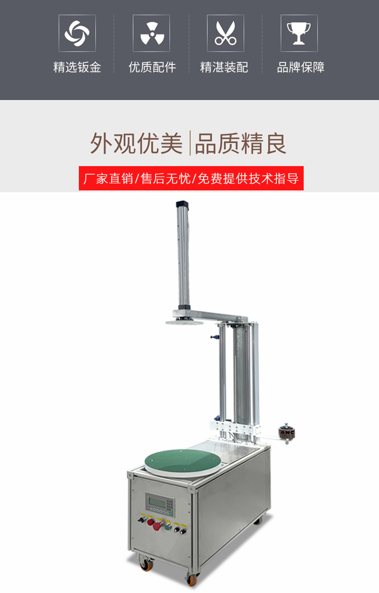 灵活性层面,它无需提前预设大量复杂参数,操作人员仅需简单培训,就能快速完成不同尺寸、不同形状产品的切换作业。通过人工微调定位与缠绕角度,实现高效适配,完美契合多品种、小批量的生产模式。同时,设备机身设计紧凑,无需配套自动化输送线,即便车间场地狭窄,也能灵活摆放,甚至可搭配脚轮实现移动作业,进一步拓展应用场景。
