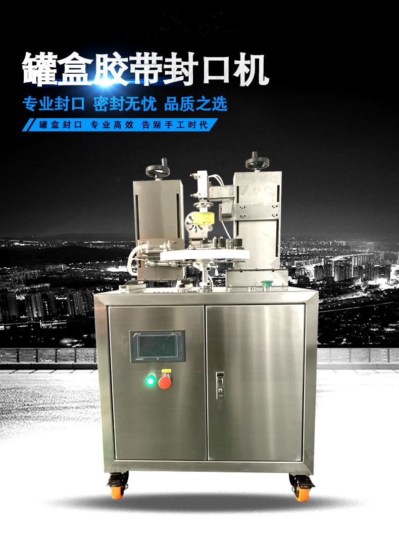 在核心性能上,罐盒胶带缠绕机搭载精准的张力控制系统,可根据罐盒材质(金属、塑料、纸盒等)和胶带规格(宽度30-60mm常规规格全覆盖),自动调节胶带松紧度,既能保证胶带紧密贴合罐盒表面,无褶皱、无气泡、无松动,又能避免因张力过大导致罐盒变形、破损,或张力过小造成密封不严的问题,适配不同厚度、不同形状的罐盒需求。设备配备高精度定位装置,无论是圆形、方形、多边形,还是不规则形状的罐盒,都能实现精准定位、均匀缠绕,缠绕圈数可根据企业需求自由设定(1-5圈可调),既能满足基础密封需求,也能实现强化防拆、加固效果,适配食品、日化、礼品、五金等多行业的包装标准。