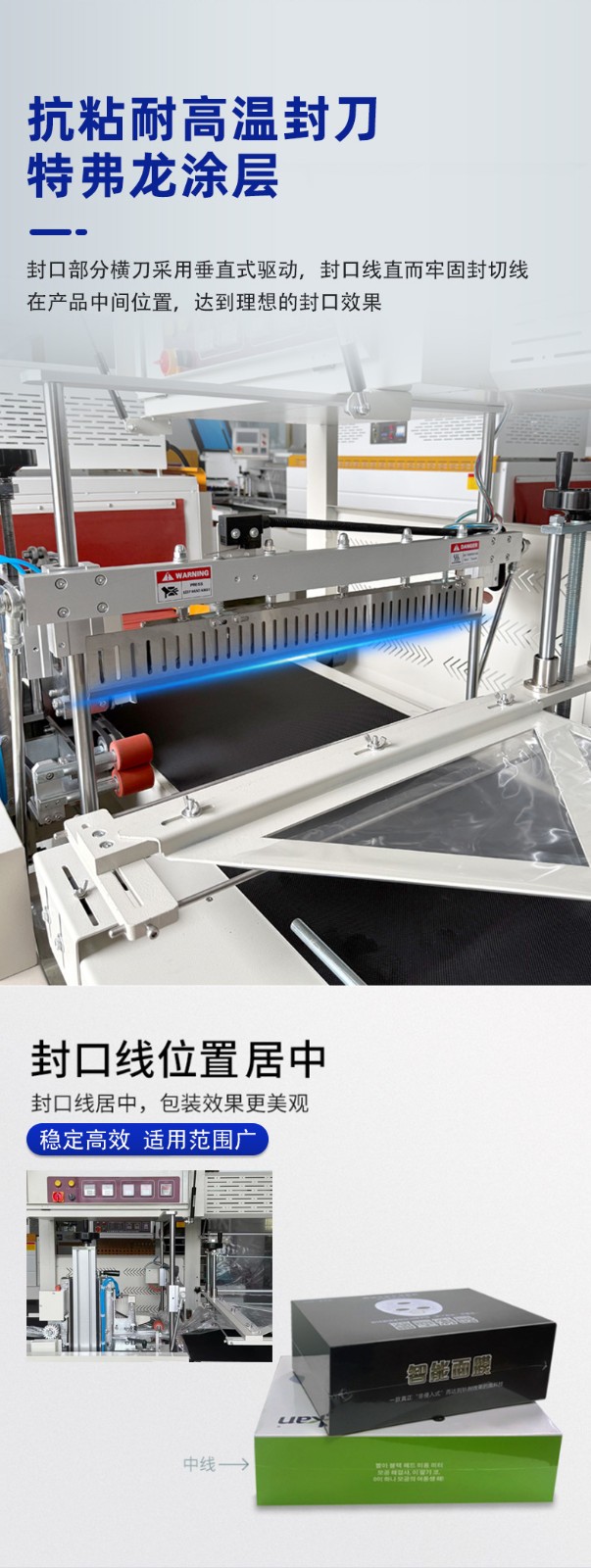 - 封切效果好5:封切刀通常采用杜邦特弗龙涂层抗粘耐高温铝合金刀,封口牢固,不会开裂、焦化,且封口线直而美观。部分设备还具备封切刀保护装置,可防止误切包装物。
