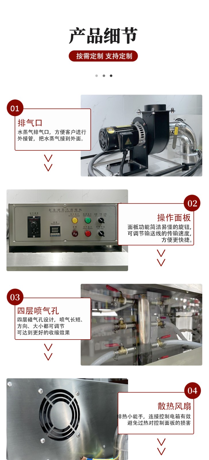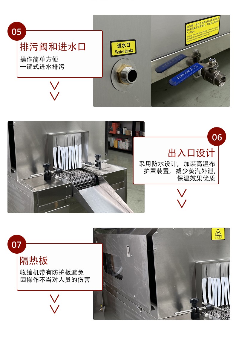 设备的结构设计围绕 “蒸汽产生 - 加热收缩 - 产品输送 - 参数控制” 展开,核心部件包括四大模块: