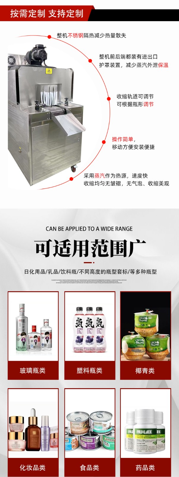 - 食品饮料行业:用于瓶装饮料、易拉罐、酱料瓶的标签收缩,蒸汽加热能避免高温破坏食品,同时标签贴合度高,提升产品外观档次。