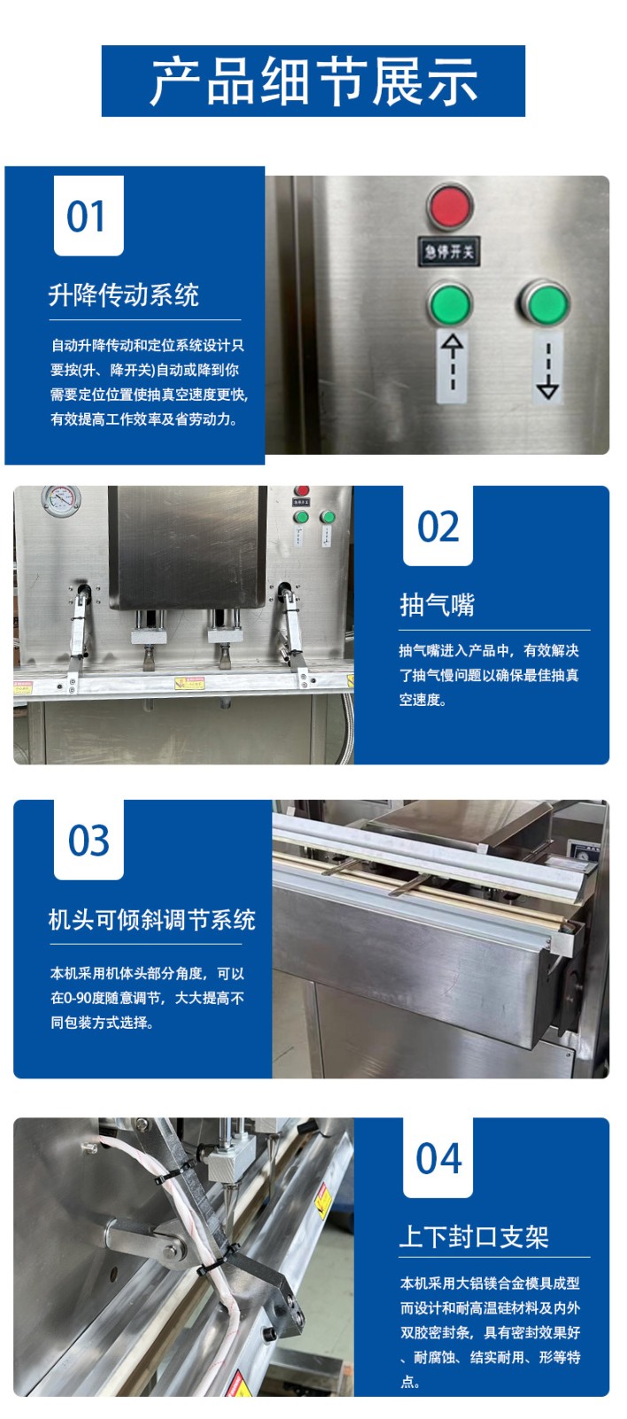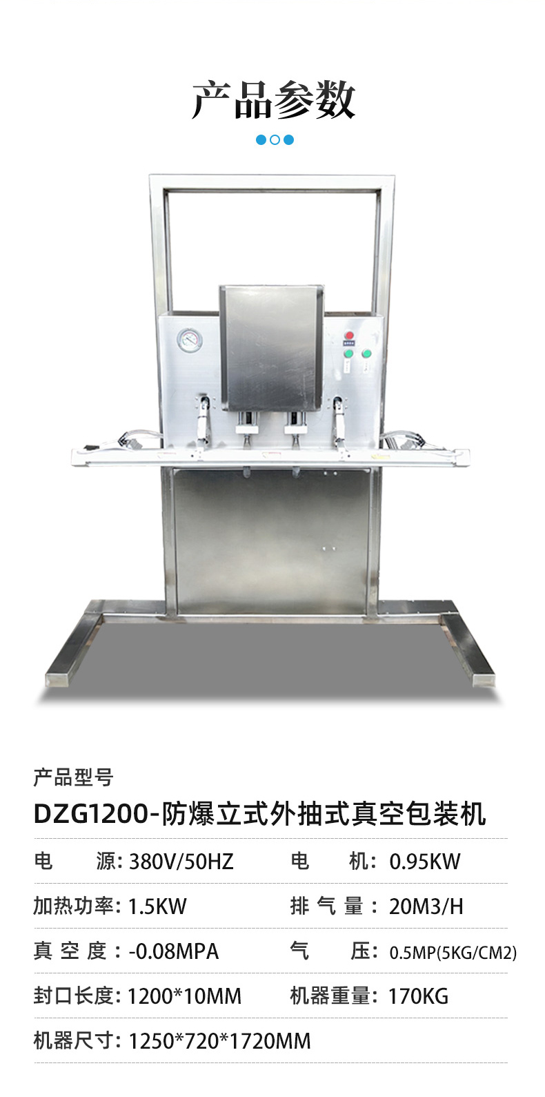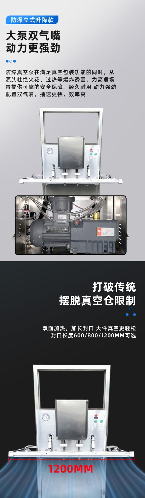 立式防爆真空包装机的防爆配置集中在电气、动力及密封过滤等关键部件,以此适配易燃易爆的特殊工况,其适用工厂也多为存在爆炸隐患的化工、医药等领域,具体如下: