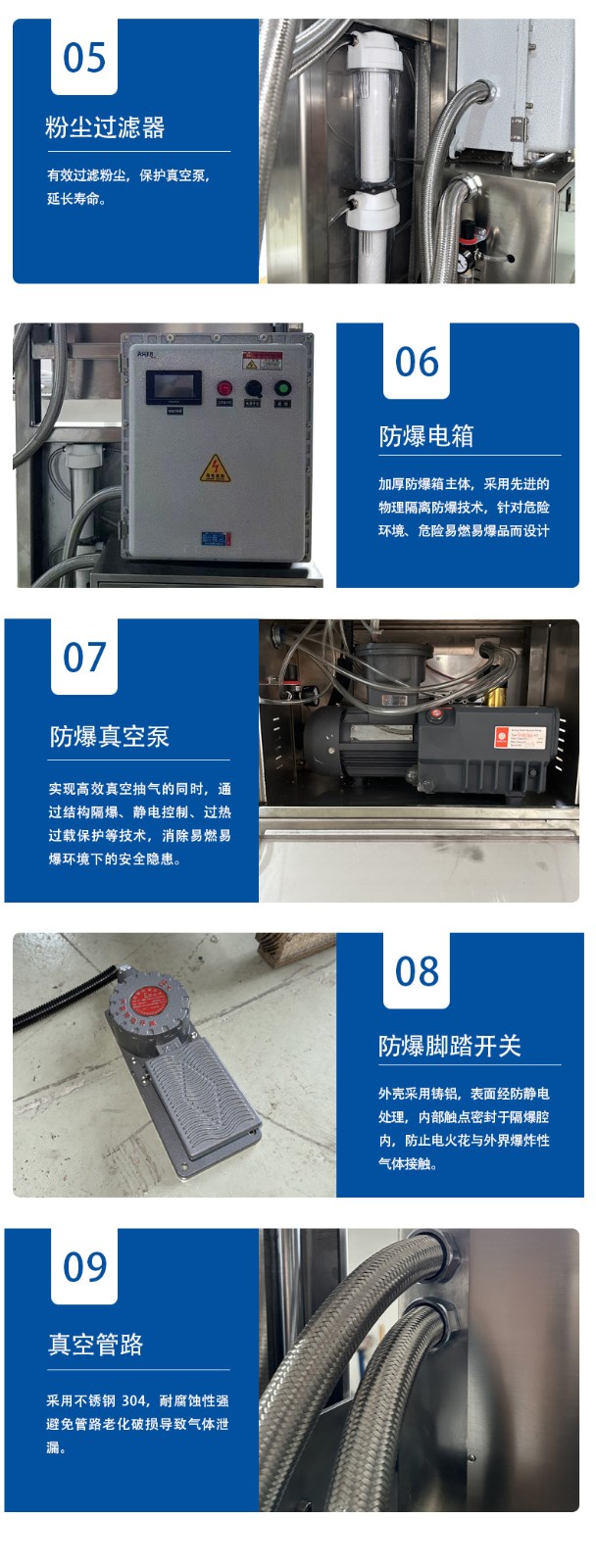 - 密封与过滤部件:机头柜和电柜均采用全密封设计并加装密封胶条,防止易燃易爆气体、粉尘进入内部损坏元件或引发短路;关键的抽气口、真空室等采用 304 不锈钢材质,部分机型还配有 40mm 厚的有机玻璃透明观察窗,既保障防爆性能又便于观察包装过程;同时加装粉末隔离和过滤装置,防止包装物料中的粉尘堵塞真空泵,避免设备故障导致的安全问题。