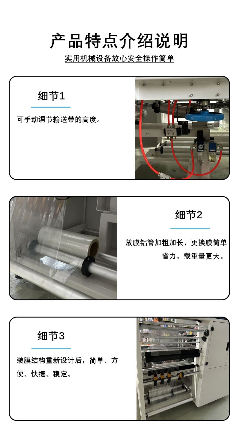 - 安全稳定,运维便捷配备急停按钮、封刀防烫伤保护罩、超温报警等多重安全装置,保障操作人员人身安全;设备关键部件采用标准化设计,结构简单易拆解,日常清洁、换膜、维护无需专业技术人员,大幅降低设备运维成本与停机时间。