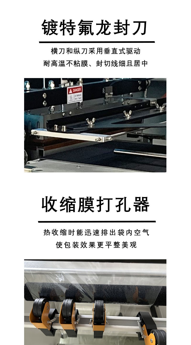 - 一体化自动化作业,降低人工成本设备集进料、送膜、封切、收缩、出料于一体,全程无需人工干预,仅需 1-2 名操作人员负责物料补充与设备巡检,相比传统人工封切 + 手动收缩的模式,可减少 70% 以上的人工投入,尤其适合大批量连续化生产场景。